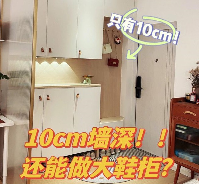 快來抄作業(yè)!10cm墻深怎么做出超大容量鞋柜?由于開發(fā)商考慮不到位,入戶大門側面的玄關墻深度只有10cm??板材十大品牌設計小能手上線啦,進門做換鞋凳+轉角的設計方式,愣是給凹出了多功能大容量的玄關柜,讓鞋子整齊有序,還能兼顧感應燈、掛包包、收納、...