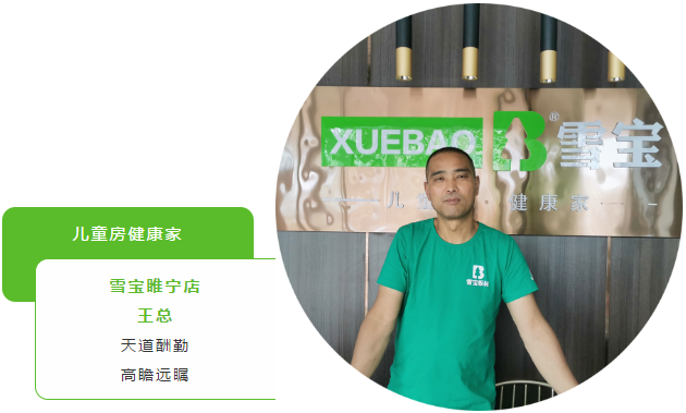 雪寶睢寧優(yōu)裝旗艦店王總加入雪寶已有多個年頭,可以說是雪寶經(jīng)銷商體系中的元老級人物了。一路走來,見證了品牌不斷發(fā)展壯大,同時,自身也因雪寶收獲成功和喜悅。正是印證了一句話,成大事者,貴在堅持!