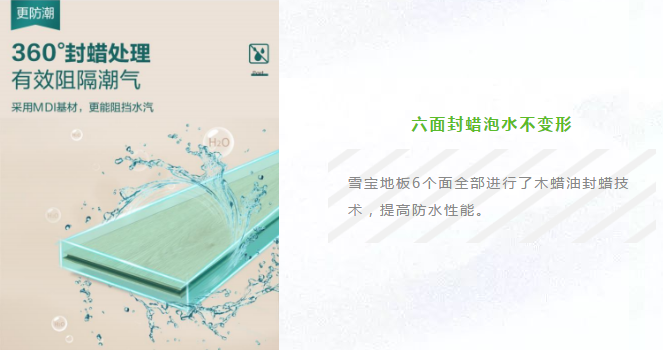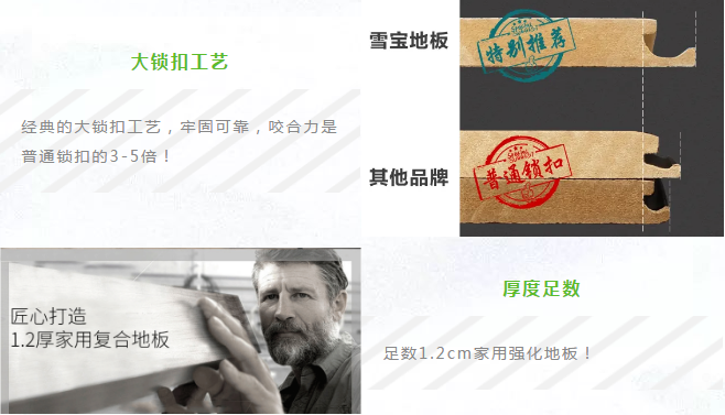 雪寶金剛面強化復合地板使用了木蠟油超級防水技術,地板厚度都是足數(shù)1.2cm,耐磨系數(shù)達到6000卷,從而大大的增加的強化復合地板的使用壽命。