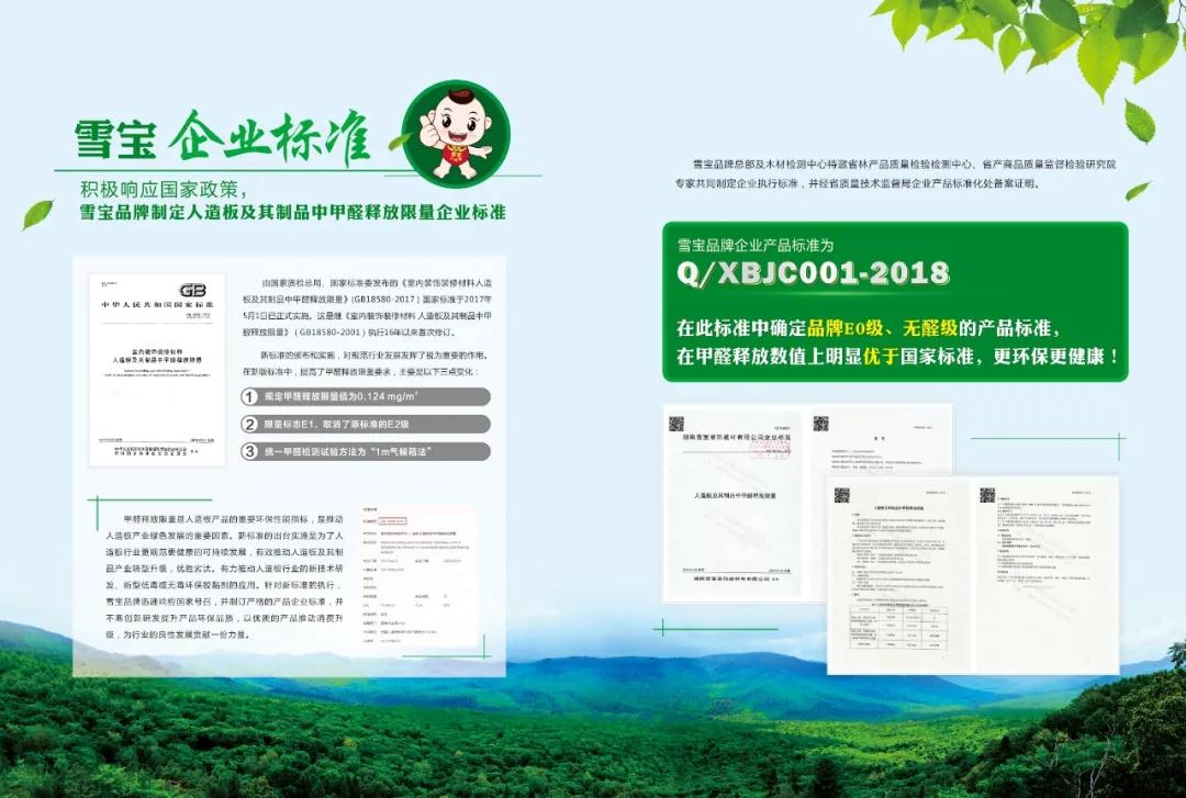 同時(shí)聯(lián)合權(quán)威機(jī)構(gòu)制定雪寶企業(yè)產(chǎn)品標(biāo)準(zhǔn),Q/XBJC001-2018在此標(biāo)準(zhǔn)中確定品牌E0級(jí)、無(wú)醛級(jí)的產(chǎn)品標(biāo)準(zhǔn),在甲醛釋放數(shù)值上明顯優(yōu)于國(guó)家標(biāo)準(zhǔn),更環(huán)保更健康!