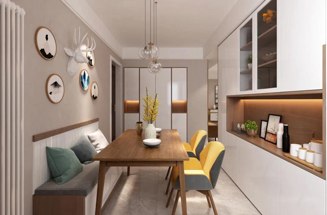 對(duì)于小戶型餐廳來(lái)說(shuō)“卡座”就是救星,卡座設(shè)計(jì)非常節(jié)省家居空間,這種設(shè)計(jì)合理地利用了家居空間,讓新房環(huán)境變得更加寬敞明亮,日常走動(dòng)也變得方便自由許多?ㄗO(shè)計(jì)也方便家庭的衛(wèi)生清潔,不用移動(dòng)太多的桌椅,也少了磕碰事件的發(fā)生,很是安全衛(wèi)生。另外,卡座設(shè)計(jì)還具備一定的收納能力,我們可以將物品擺放在卡座下方的收納格里面,緩解家庭的收納壓力,真的非常實(shí)用。使用板材十大品牌雪寶生態(tài)板還能保證甲醛釋放,不用擔(dān)心環(huán)境問(wèn)題。