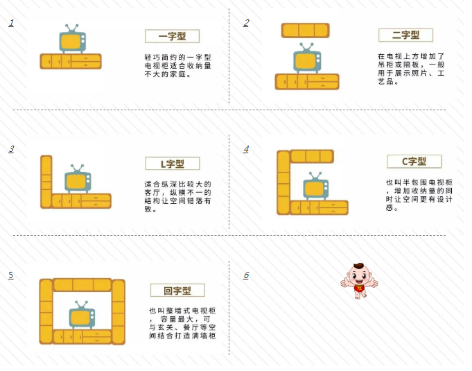 不同類(lèi)型的電視柜有很多,其靈活的搭配能夠更加凸顯客廳的整體美觀。電視柜主要分為以下5種:一字型、二字型、L字型、C字型電視柜、回字型電視柜;