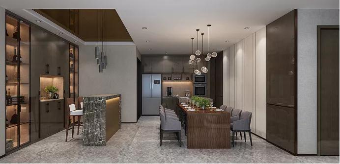 金屬酒柜充滿了輕奢氣韻,酒柜陳列錯落有致,精致在一瞬間充分體現(xiàn)。木材、金屬、玻璃的碰撞,別具一格!餐邊柜采用通透的黑色窄框玻璃門搭配,虛實(shí)結(jié)合,提升餐廳氣質(zhì)。