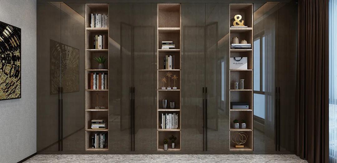 臥室衣柜在設(shè)計中同樣運(yùn)用了黑框玻璃門與高光門的結(jié)合,直線條的設(shè)計貫穿于整個空間,營造出一個時尚雅致且靈動的空間氛圍。