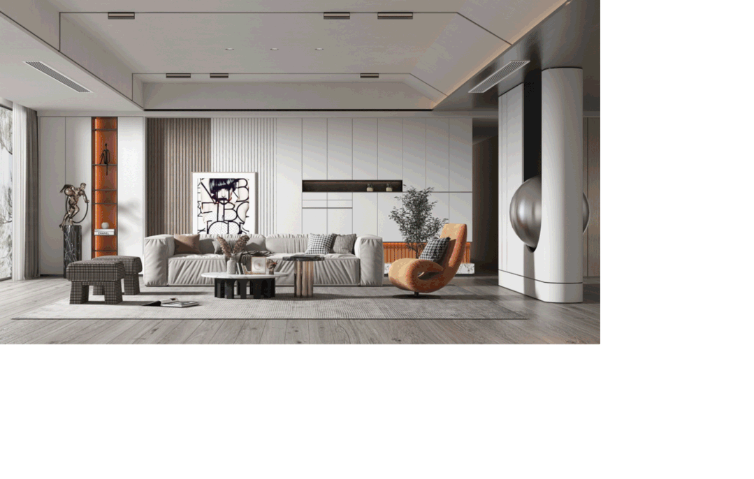 在開放式的空間布局,將空間中的飾面墻、電視柜、展示柜、收納柜等進(jìn)行有機(jī)串聯(lián),鋪設(shè)出連貫輕簡(jiǎn)而自如的功能氛圍,不同的飾面表現(xiàn)模式穿插其間,塑造出維度豐富、視覺(jué)飽滿的一體化系統(tǒng),更將優(yōu)雅與沉穩(wěn)彌散進(jìn)空間的每個(gè)角落。