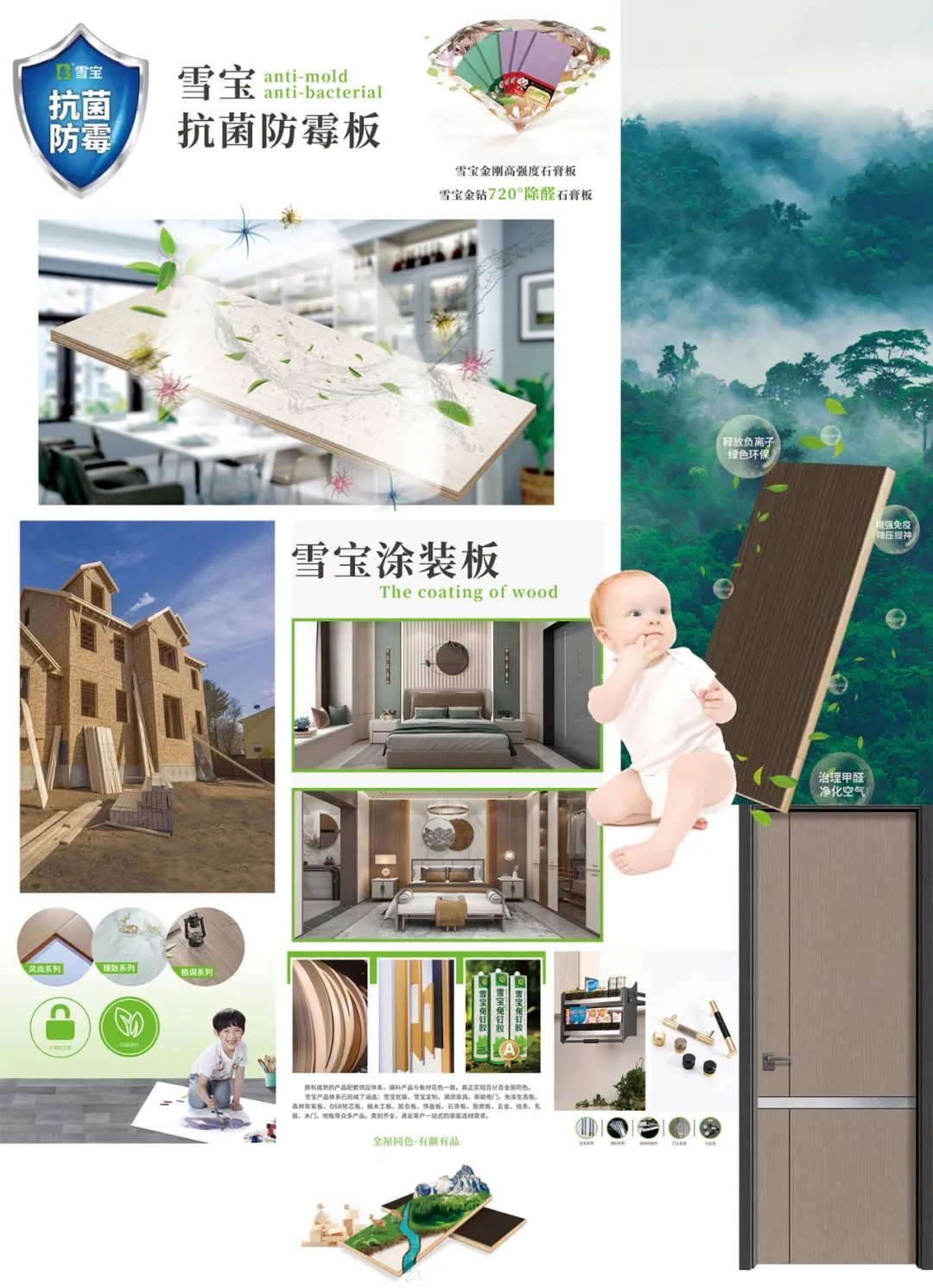 目前,雪寶板材系列產(chǎn)品擁有細(xì)木工板、膠合板、智芯板、石膏板等基礎(chǔ)板材;木飾面、家具板、生態(tài)板、貼面板等飾面板材;森林有氧板、抗菌防霉板、難燃阻燃板、金鉆720°除醛石膏板等功能型板材,諸多花色搭配選擇,滿足個(gè)性定制設(shè)計(jì)需求。
