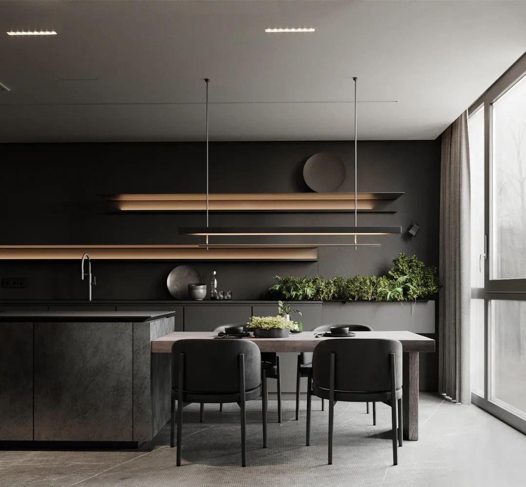 靠廚房設(shè)計為大理石或巖板,另外一邊設(shè)計為餐桌,這種設(shè)計動線也十分流暢。大理石或巖板可以放洗好的菜和碗碟,另一邊可直接吃飯,這種空間少了隔墻隔斷,也會顯得更加開闊明亮。