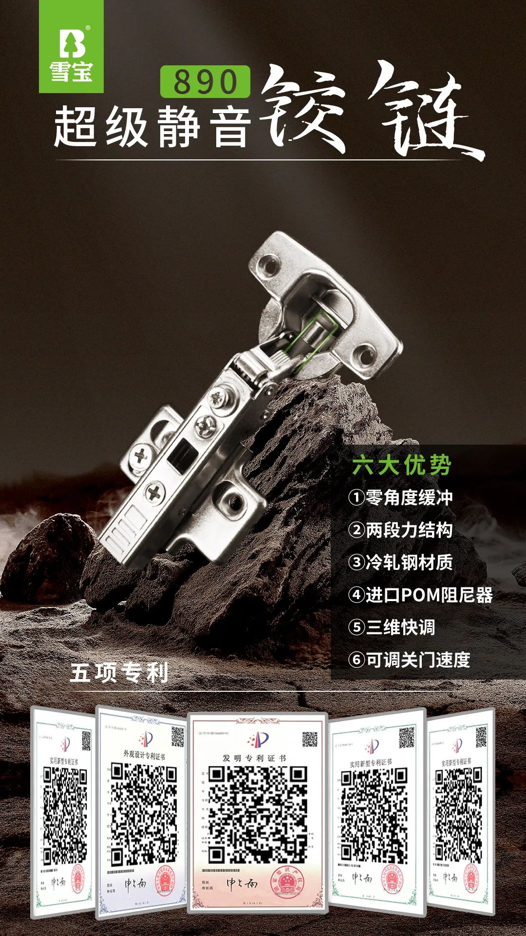 雪寶超級(jí)靜音鉸鏈系列產(chǎn)品匠心鑄造,采用國(guó)際領(lǐng)先的工藝技術(shù),超強(qiáng)防銹、靜音緩沖、安裝便捷等能力經(jīng)得起種種考驗(yàn),無(wú)論在油煙聚集的廚房,還是潮濕通風(fēng)不佳的洗手間,依然保持光亮如新,輕柔無(wú)聲,開(kāi)合自如!此次雪寶890超級(jí)靜音鉸鏈升級(jí)研發(fā),具備零角度緩沖、兩段力結(jié)構(gòu)、冷軋鋼材質(zhì)、進(jìn)口POM阻尼器、三維快調(diào)、可調(diào)關(guān)門(mén)速度6大優(yōu)勢(shì),并且這是一款已經(jīng)獲得1個(gè)國(guó)家發(fā)明專(zhuān)利、3個(gè)實(shí)用新型專(zhuān)利、1個(gè)外觀(guān)專(zhuān)利的超級(jí)靜音鉸鏈!