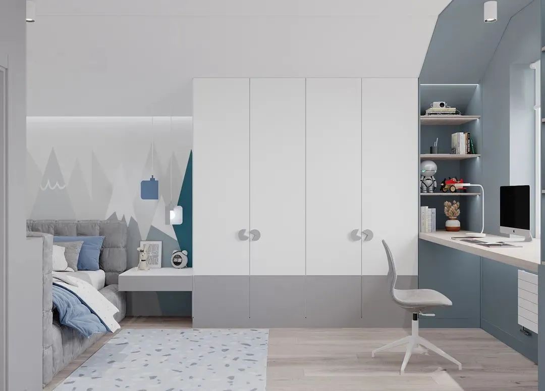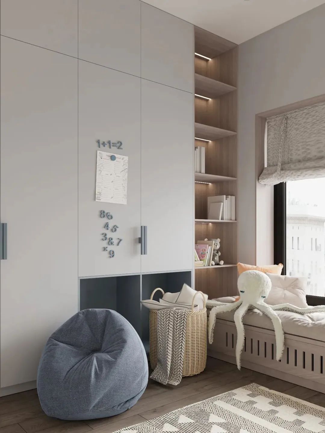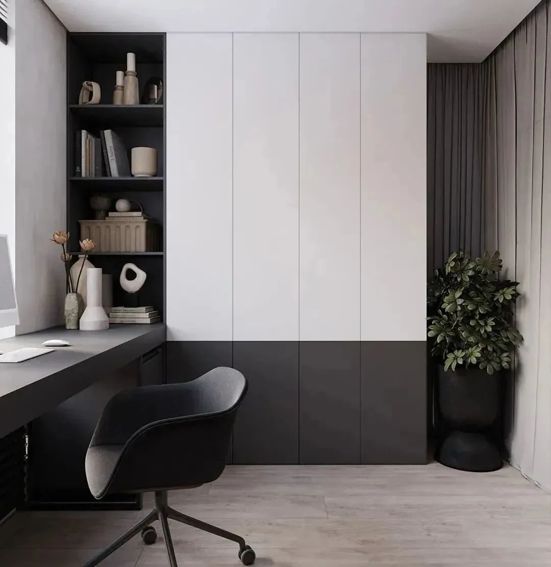 衣柜和書柜的組合設(shè)計(jì)是目前非常流行的一種組合方式,具備寧?kù)o特征的衣柜搭配上需要安靜的書柜。不浪費(fèi)空間,又層次漸進(jìn),保持了美感,又兼具了實(shí)用性,非常適合小戶型臥室使用。