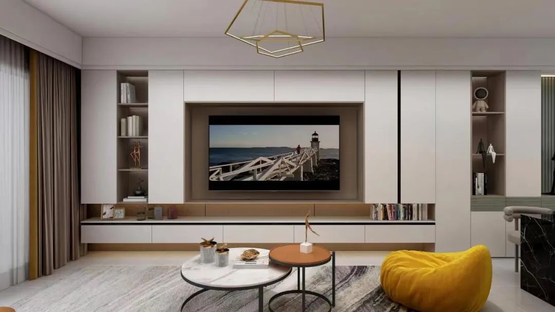 電視柜+餐邊柜整墻定制,這種設計適用于一體式的客餐廳,不僅能提升客餐廳的儲物能力,還能拉長客廳視覺,讓小空間更顯大。