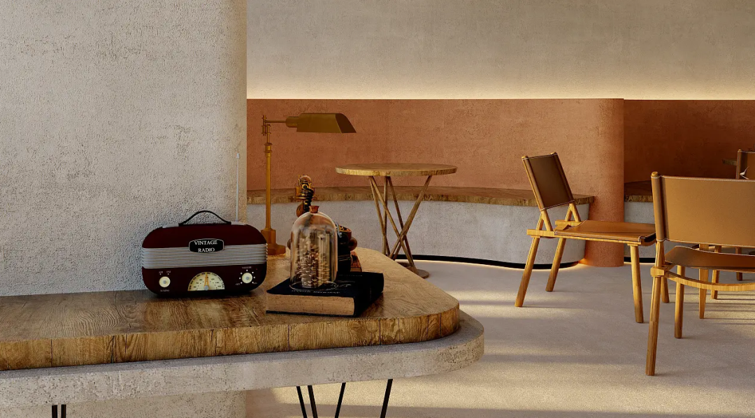 斑駁的墻面讓時間在此消逝,回歸事物的本質(zhì)。墻面上刻意營造的坑洼質(zhì)感,層層堆疊似光陰流逝帶來的滄桑感,在訴說著時間留下的故事。