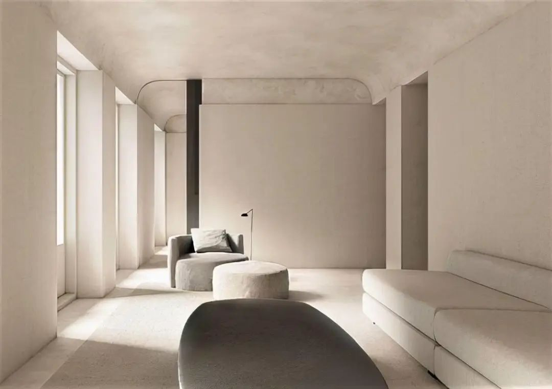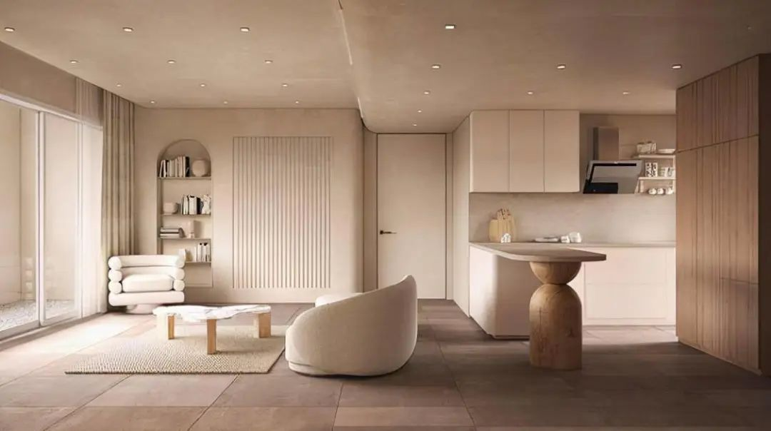 侘寂風的設計,沒有復雜的裝飾、圖案花紋,墻頂?shù)氐恼w造型盡量簡潔大方。
