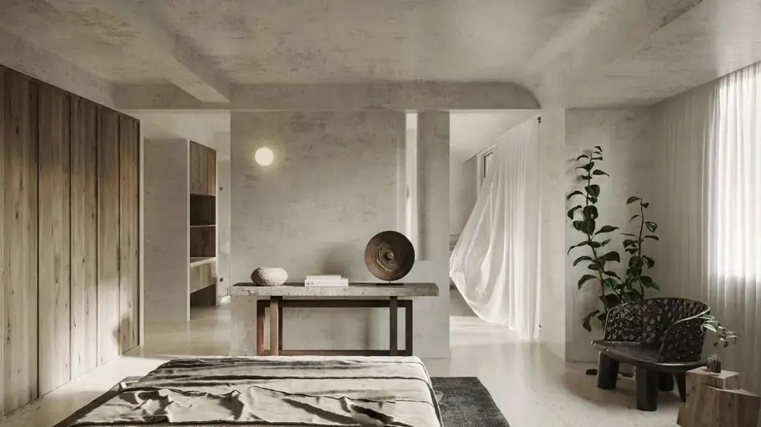 侘寂風多采用天然質(zhì)感的材質(zhì),整體效果質(zhì)樸自然。除卻侘寂本身的質(zhì)感,空間同樣有極簡的美感。