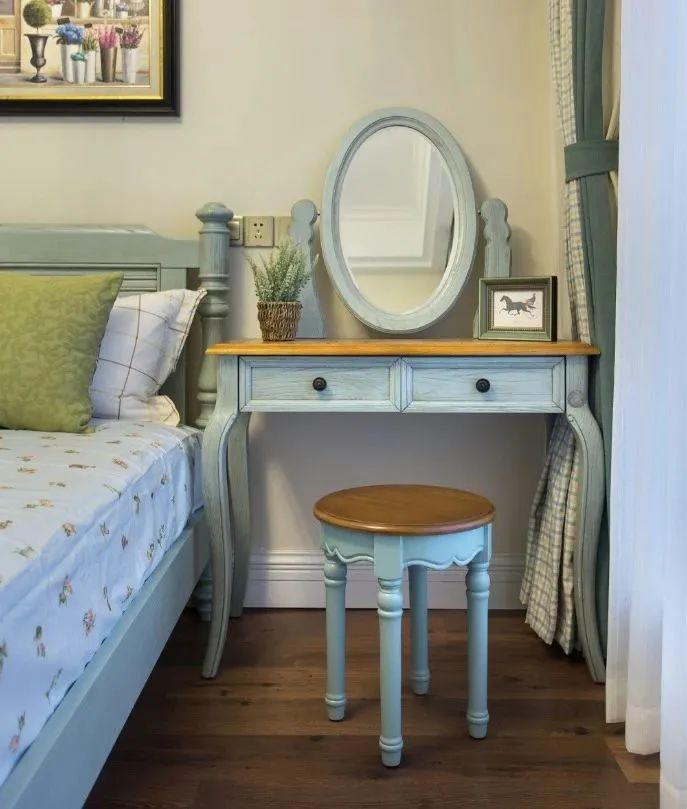 床頭柜的位置如果足夠?qū)挸ǖ脑,還可以考慮擺放一張梳妝臺(tái),這樣又可以起到床頭柜的作用,同時(shí)又滿足日常梳妝打扮的需求。