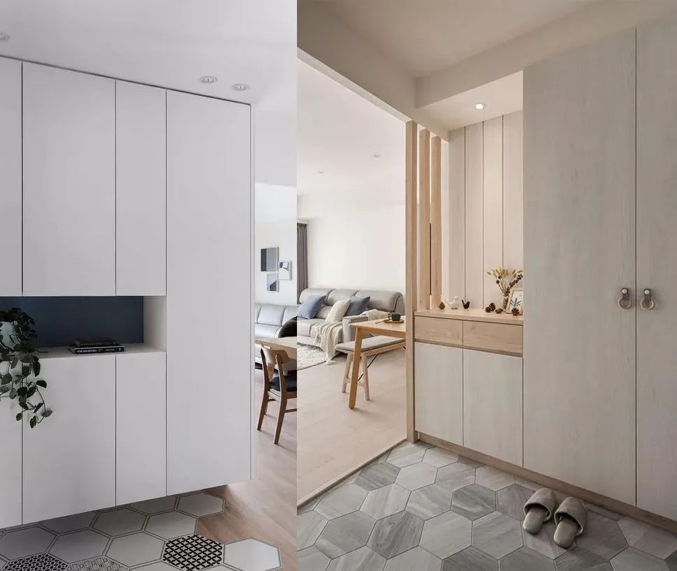 如果玄關(guān)客廳通鋪瓷磚那就比較好處理,如果客廳想鋪木地板的話,玄關(guān)地面可以選用瓷磚來進行一個空間分隔,這樣不僅有高顏值,還能方便清潔劃分區(qū)域。