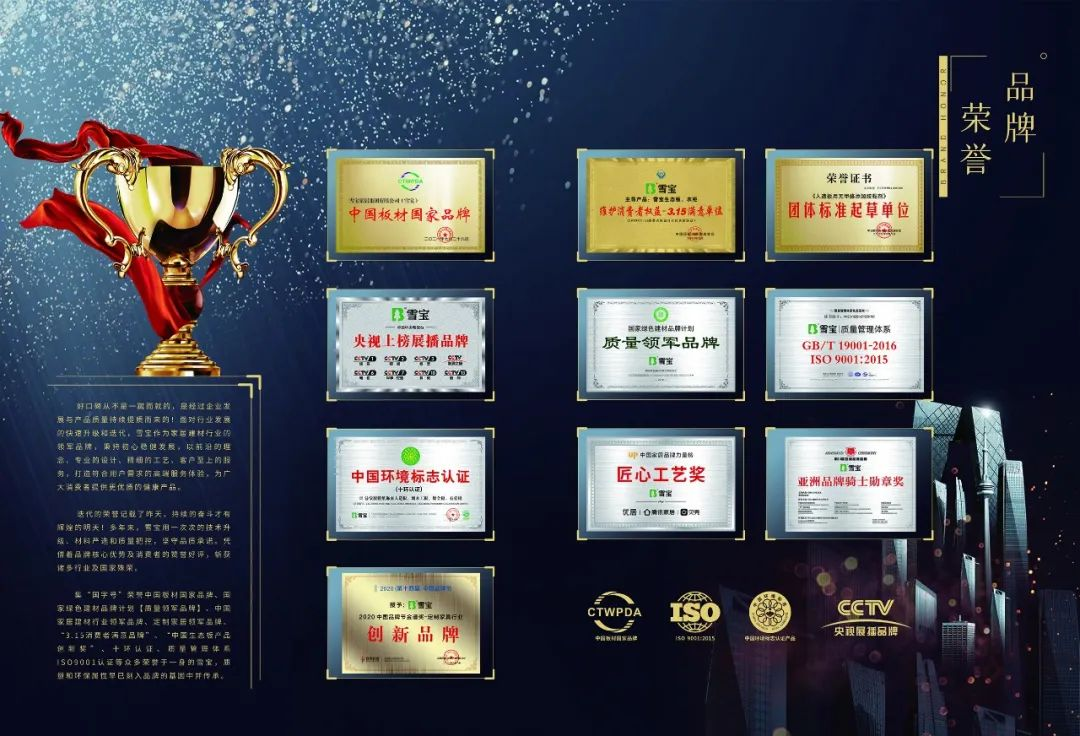 雪寶板材作為“兒童房健康板”創(chuàng)立者以及環(huán)保標(biāo)準(zhǔn)的首倡者,斬獲的國家級、重量級的品牌榮譽獎項逾100+,見證和締造了雪寶品牌在行業(yè)地位和高度。雪寶品牌的實力、影響力和知名度以及消費者信賴度一直以來名列前茅,穩(wěn)穩(wěn)立足于頭部品牌行列。近30載專注環(huán)保板材領(lǐng)域,深厚的行業(yè)沉淀、強大的品牌實力、出眾的品牌口碑,在眾多板材品牌中脫穎而出,于“中國板材與定制家居大會”摘獲3項大獎!