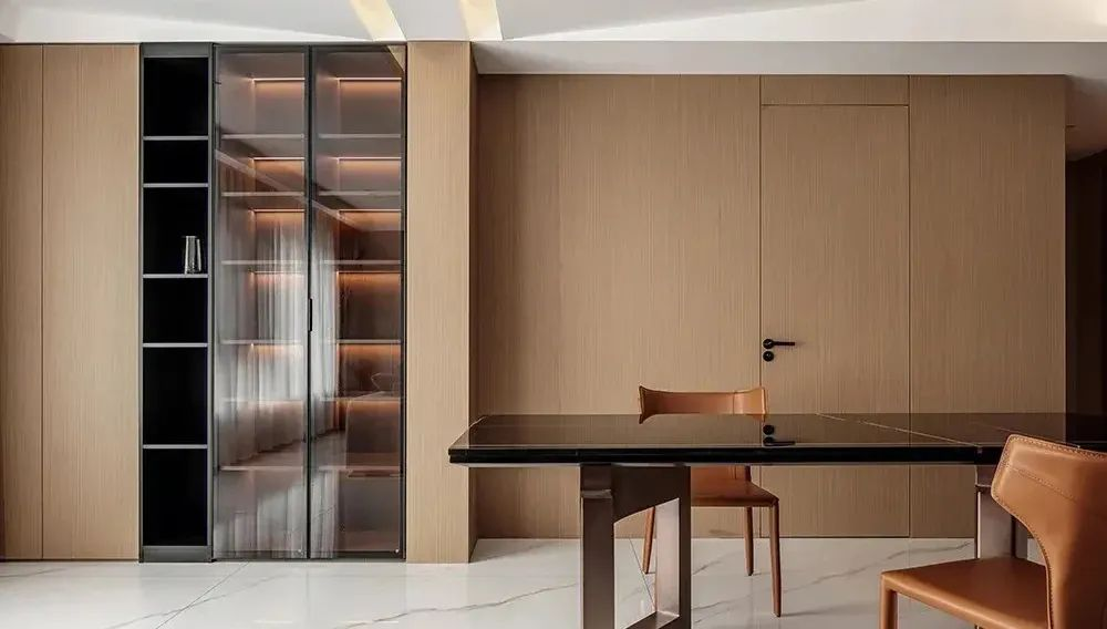金屬框玻璃門板營(yíng)造的輕奢空間氛圍,讓高級(jí)感融入生活。磨砂質(zhì)感或是茶色玻璃柜門,朦朧模糊的鏡面,無形中增添了空間的藝術(shù)美感。