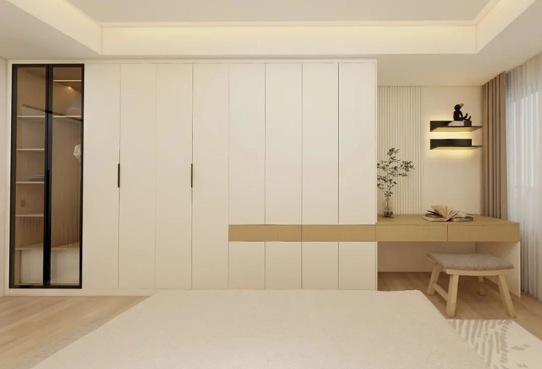 衣柜組合小巧書桌柜,充分利用空間,且不會(huì)有整面柜子的壓迫感。臥室同時(shí)具備休憩、收納以及閱讀等功能,方便日常隨時(shí)閱讀或辦公。