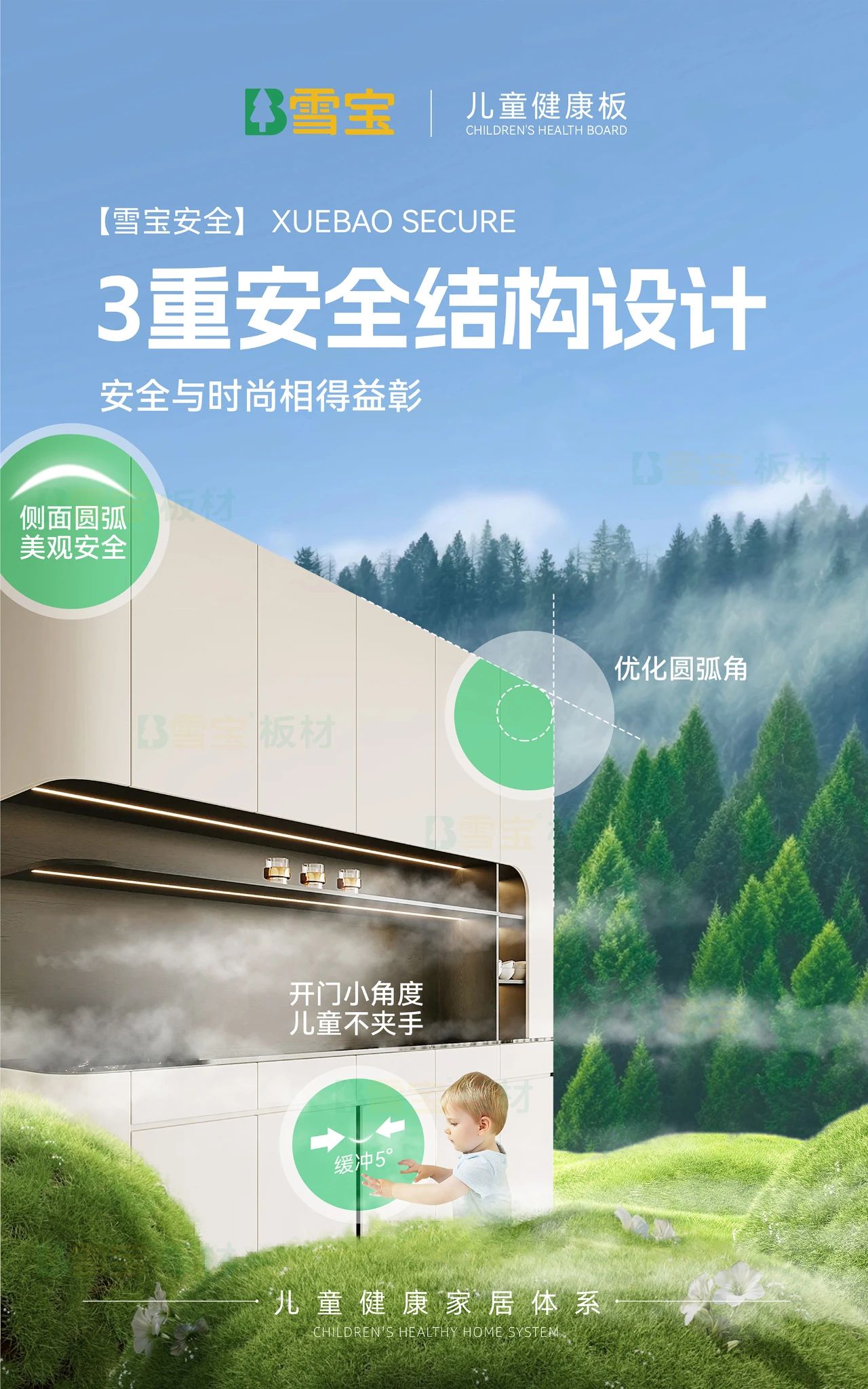 采用雪寶3重安全門柜設計,一重圓弧式安全設計,柜體邊緣及尖端進行圓滑處理;二重開合防擠壓設計,應用高性能緩沖五金件,避免玩耍時的擠壓;三重突出物保護設計,減少柜體拉手、螺絲的露出,增加隱形內(nèi)拉手、二合一隱形安裝工藝等,在減少孩子每一個磕碰可能的同時,還呈現(xiàn)出時尚極簡的線條美感。