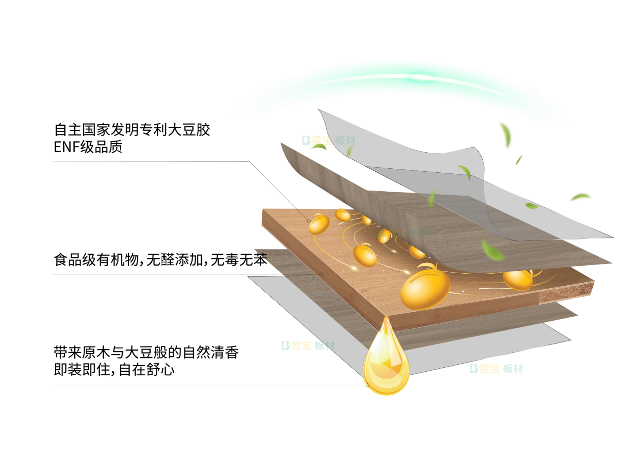 使用自主擁有的國(guó)家發(fā)明專利大豆膠(利用純天然、可再生的豆粕為原料,精萃大豆活性蛋白,濃縮為性能優(yōu)異的生物質(zhì)大豆膠)進(jìn)行黏合,0醛添加,環(huán)保等級(jí)達(dá)到新國(guó)標(biāo)ENF級(jí),無(wú)需擔(dān)心甲醛釋放問(wèn)題,且具有卓越的耐水性、粘結(jié)性,品質(zhì)穩(wěn)定,是您打造家居空間的放心之選。
