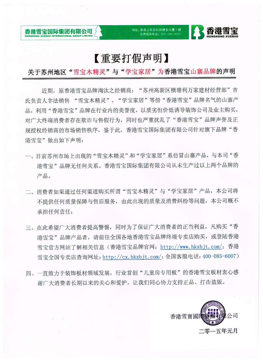 近期,原雪寶品牌淘汰之經(jīng)銷商:“蘇州高新區(qū)橫塘利萬家建材經(jīng)營部”吉氏負(fù)責(zé)人非法銷售 “雪寶木精靈”、“學(xué)寶家居”等傍“雪寶”品牌名氣的山寨產(chǎn)品,利用“雪寶”品牌在行業(yè)內(nèi)的美譽度,以質(zhì)劣但價低誘導(dǎo)裝飾公司及業(yè)主購買,對廣大終端消費者存在欺詐與售假行為,同時也嚴(yán)重擾亂了“雪寶”品牌聲譽及正規(guī)授權(quán)經(jīng)銷商的市場銷售秩序,鑒于此,雪寶集團有限公司針對旗下品牌“雪寶”做出如下聲明: