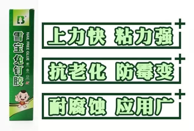 抗老化·防霉變 雪寶免釘膠施膠后不會下陷,可做填縫使用,干后可繼續(xù)上油漆,具有良好的防潮、防霉、抗嚴寒等耐受性能。