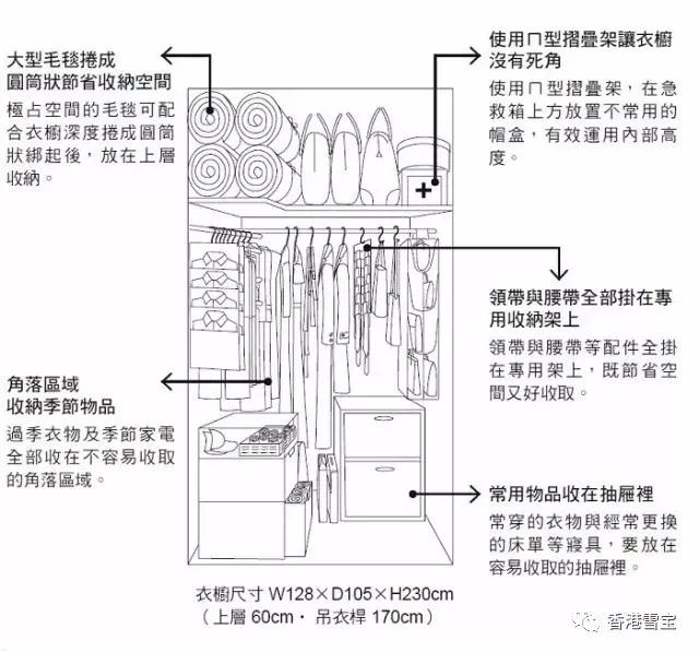 由于上層不容易收取,因此擺放過季或者不常用的物品。將使用頻率較低的物品往內(nèi)部收納是訣竅。