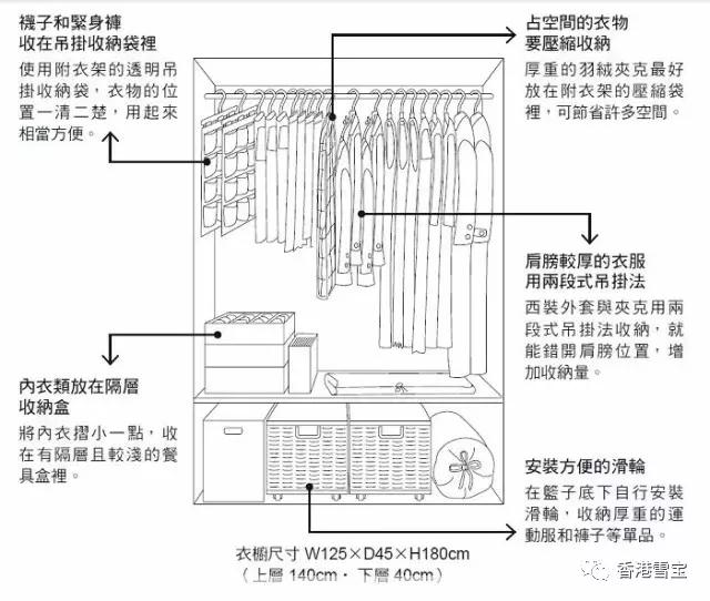 使用附衣架的透明吊掛收納袋,衣物的位置一清二楚,用起來相當(dāng)方便。