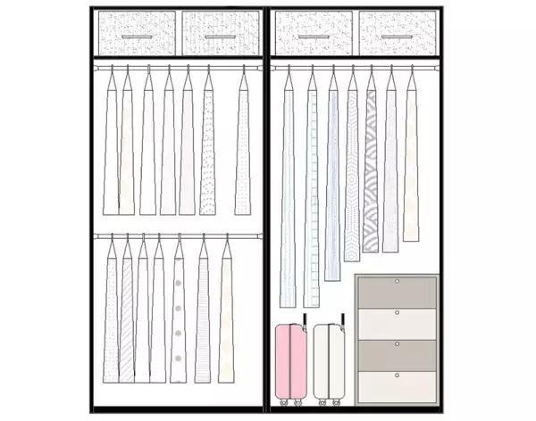 同時(shí)對(duì)目前的衣服數(shù)量與類(lèi)別有清晰的了解,能夠確定衣柜的大小;對(duì)衣服進(jìn)行分類(lèi),并為其安排合適的收納方式(平疊、豎疊、懸掛);根據(jù)衣服的比例分配掛桿、隔板、抽屜的位置與數(shù)量,并為后期的變動(dòng)留出可以調(diào)整的空間。