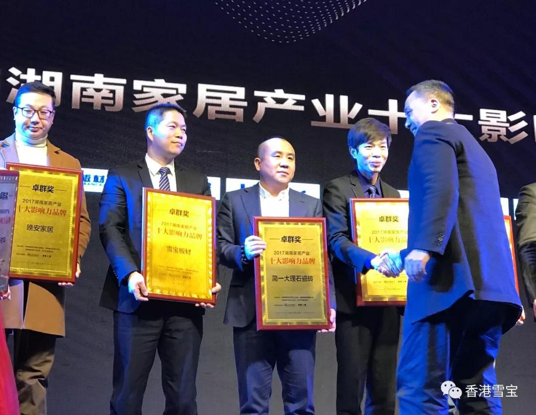 ▲2017年度卓群獎家居產(chǎn)業(yè)十大影響力品牌頒獎,雪寶國內(nèi)營銷中心熊總(左二)上臺領(lǐng)獎;